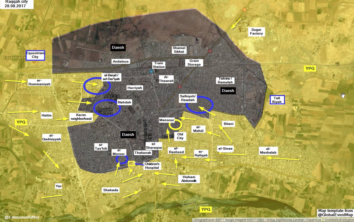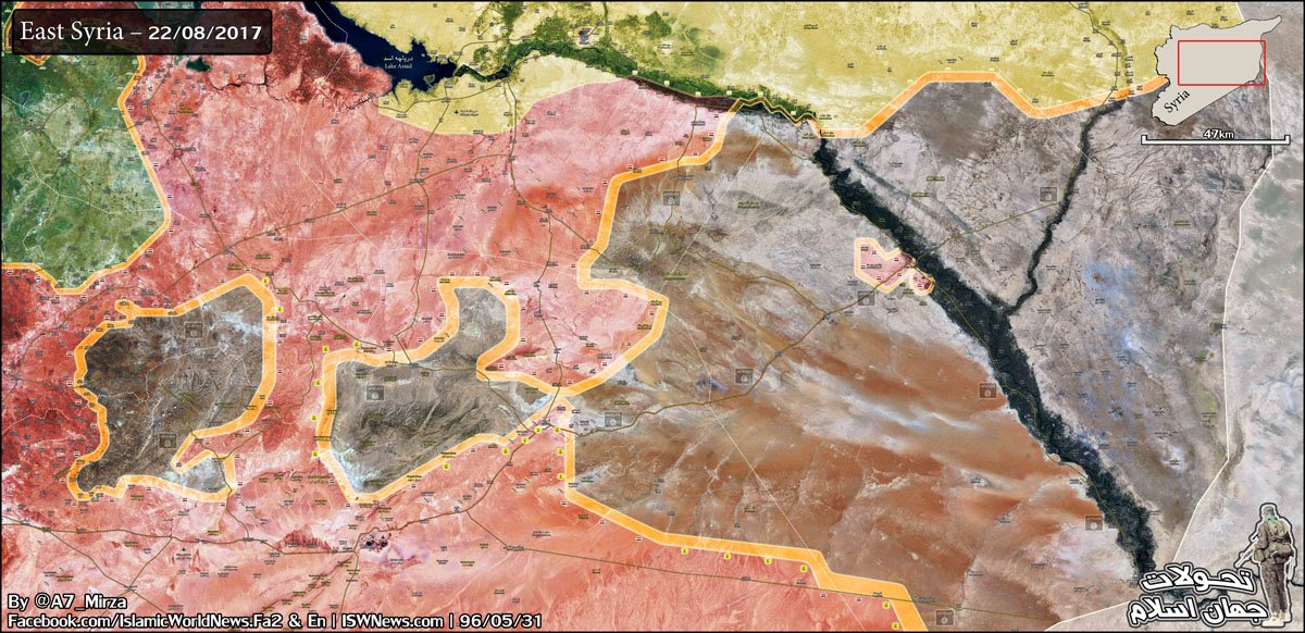 v snahe stabilizovať situáciu na tomto smere. Na Sýrsko-Libanonskej hranici sa vládnym jednotkám podarilo, úplne oslobodiť územie z rúk teroristickej organizácie Islamský štát. Po niekoľkodňovej ofenzíve vládnych jednotiek, ktorá bola koordinovaná s libanonskou armádou sa podarilo zatlačiť teroristov a donútiť ich vzdať sa. Dnes odišiel posledný autobus s ozbrojencami a územie je plne pod kontrolou vládnych vojsk oboch krajín. V meste Rakka pokračuje ofenzíva vedená USA a kurdskými ozbrojencami proti Islamskému štátu. Viac informácii o situácii v meste Rakka je v článku na sputniku (stačí kliknúť na odkaz otvorí sa priamo spomínaný článok), kde podrobne rozobrali problematiku aj celkovú situáciu.