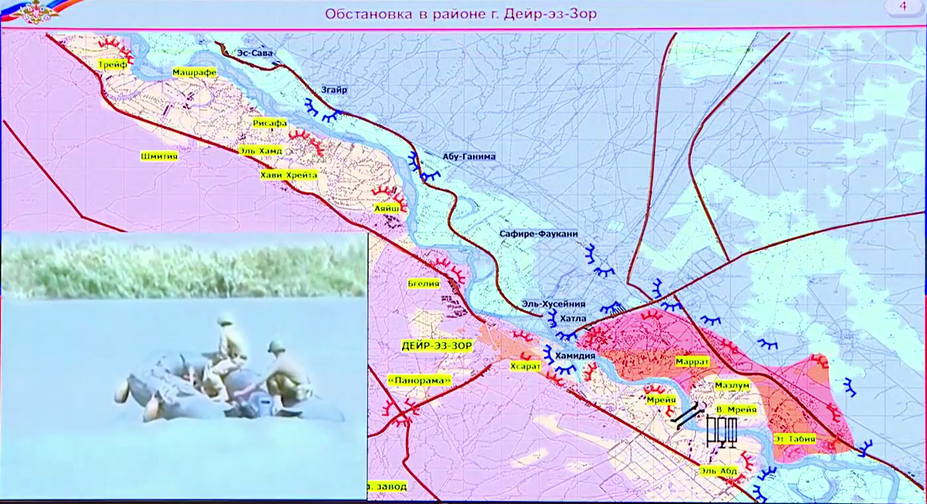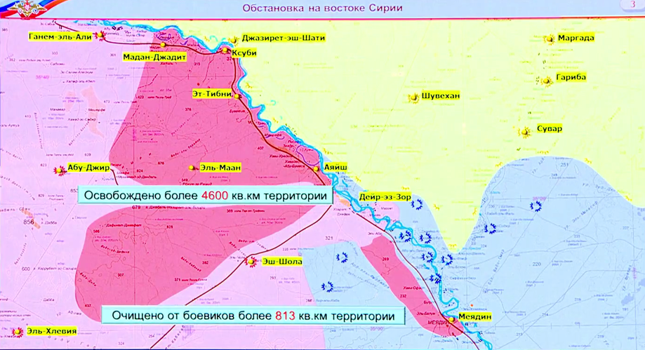 juhovýchodne od mesta Deir Ezzor a oslobodili územie o rozlohe 813 štvorcových kilometrov od teroristov. Jednotkám sa podarilo vstúpiť do mesta Mayadin. Toto mesto je najväčšie pod kontrolou ISIS. Teroristi počítali s premenou mesta na opevnenú pevnosť. Do Mayadinu preskupovali najúčinnejšie ozbrojené jednotky. Mesto bolo obkľúčené a oslobodenie jeho centrálnych štvrtí je dokončené. Nástupný priestor okolo mosta na východnom brehu rieky Eufrat sa rozširuje. Ofenzíva na sever a juh vyvíja úspešne. Inžinierske jednotky SAA a ruskí vojenskí špecialisti, nainštalovali tri pontónové trajekty a most cez rieku Eufrat, s cieľom poskytnúť neobmedzenú podporu