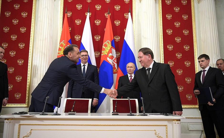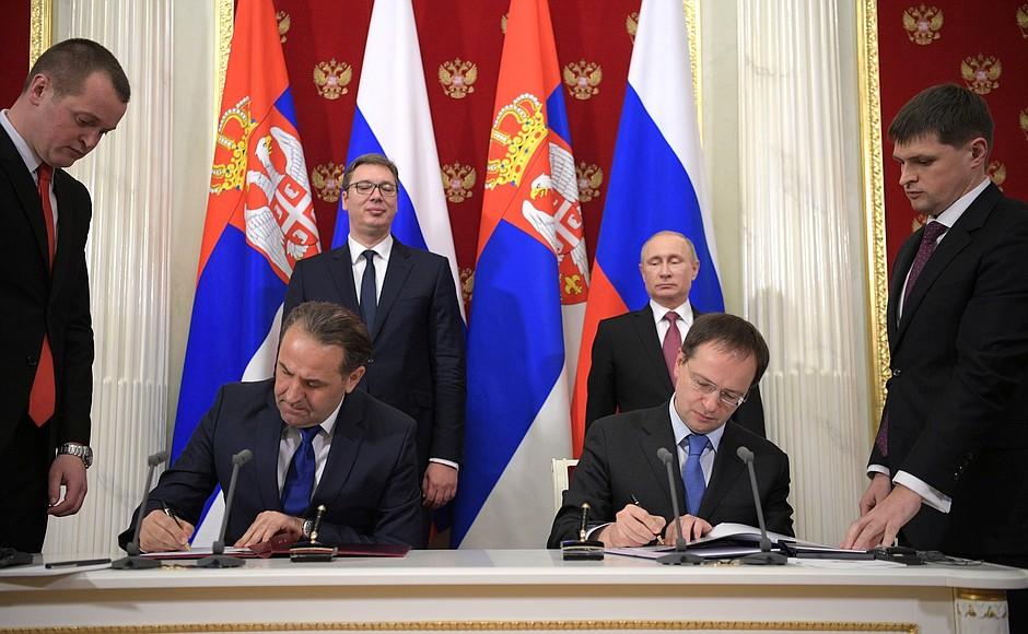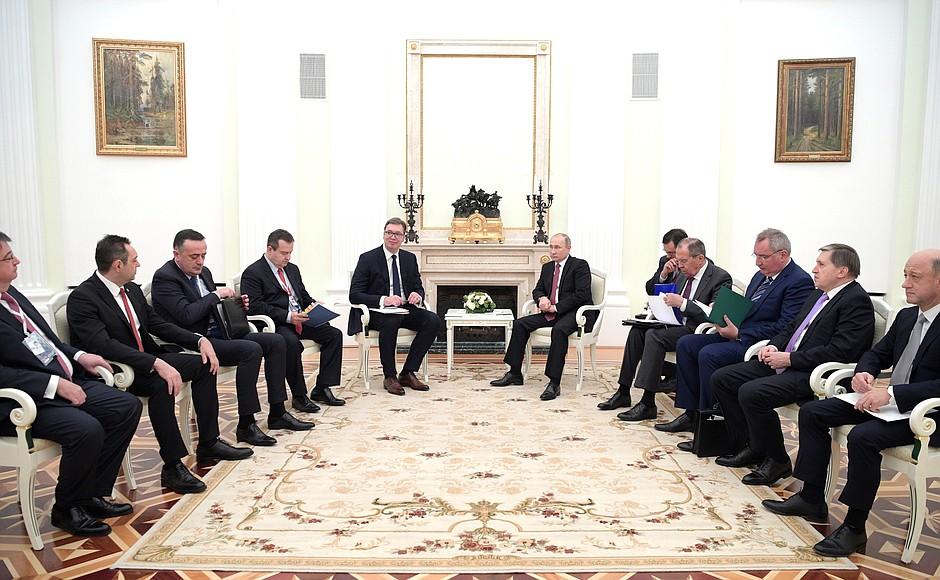 Prezident srbskej republiky Aleksander Vucič a jeho minister zahraničia Ivica Dacič navštívili v utorok Ruskú federáciu. Hneď po prílete sa stretli s ministrom zahraničia RF Sergejom Lavrovom a vo večerných hodinách, sa uskutočnilo stretnutie s prezidentom Ruskej federácie Vladimírom Putinom. Na záver rozhovorov bolo podpísaných niekoľko bilaterálnych dokumentov. Počas tlačovej konferencii Vladimír Putin informoval média o výsledkoch rozhovorov.