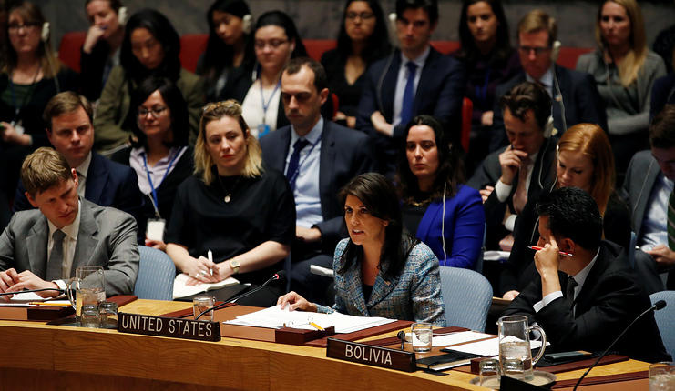 koridory uskutočnené Ruskom a verejne popravuje civilistov za pokusy opustiť vojnovú oblasť, aby ich mohla využívať ako živé štíty. Naviac stála zastupiteľka Spojených štátov si neuvedomila, že oficiálne priznala na pôde OSN, snahu Spojených štátov hrubo porušiť medzinárodné právo, keďže na vojenskú agresiu proti Sýrskej arabskej republike, nemajú mandát OSN. „Pripravili sme nový návrh uznesenia o vytvorení režimu prímeria, ktorý nenechá žiadne medzery, je jednoduchý, a záväzný,“ – povedala Haleyová a dodala, že prijatie tohto dokumentu je nevyhnutné, pretože uznesenie o zavedení 30-dňovej humanitárnej pauzy, schválenej Bezpečnostnou radou 24. februára, nedosiahlo svoj cieľ, keďže Damasek a Ruská federácia pokračuje vo vojenských operáciách proti teroristickým skupinám nachádzajúcich sa vo Východnej Ghúte, čo umožňuje rezolúcia 2401.